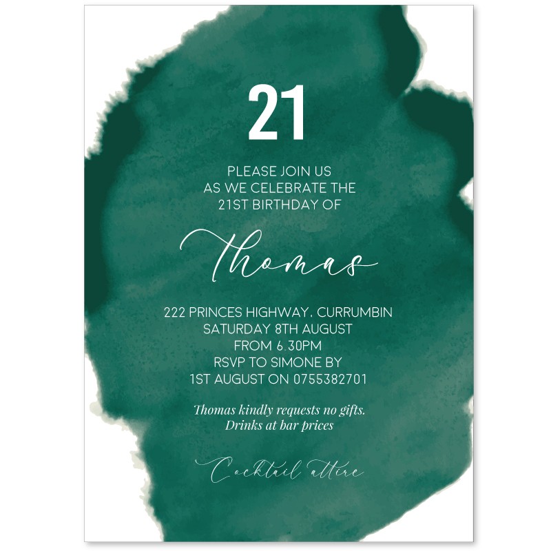 Beautiful Green Watercolour Invitations designed with careful use of contemporary typography. Simply edit online and your text alignment will be customized to perfection by our team of designers. Set the tone for your big celebration by ordering Paper Divas Custom Designer Invitations. Satisfaction guaranteed.