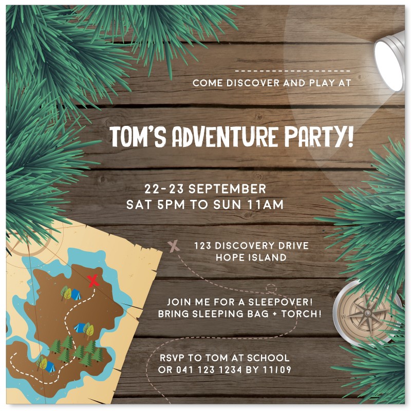 Plan a fun adventure party with Paper Divas designer Invitations. Personalise online in minutes using our unique card editor. Satisfaction Guaranteed.
