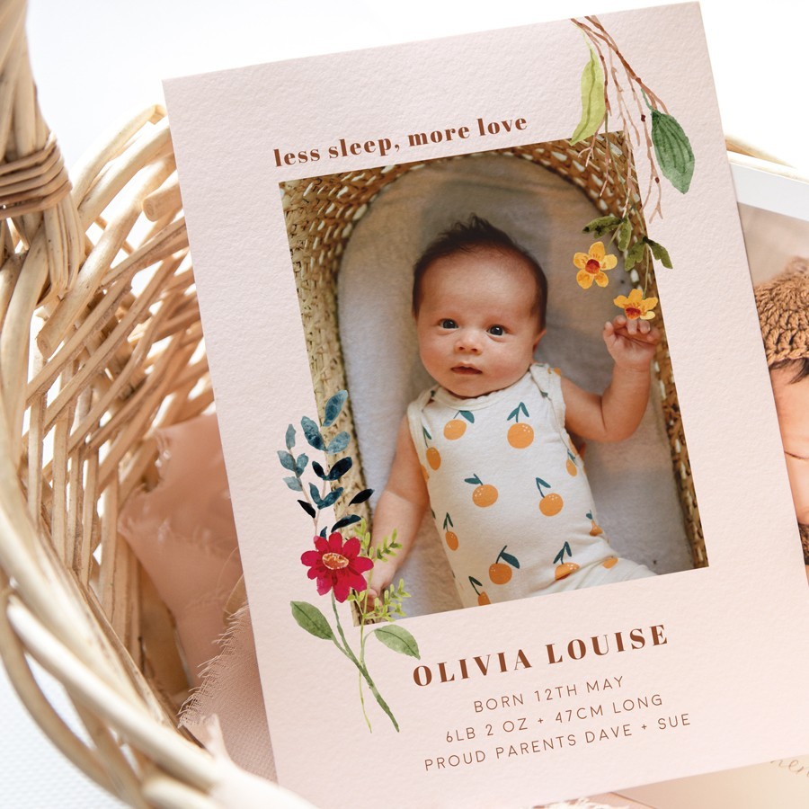 Easily personalise these Stunning Birth Announcement cards online in minutes. Beautifully designed by our in-house team of designers, these baby announcement cards are the perfect way to introduce bub and thank friends and family for their support. Simply upload your precious photo and bubs details online in the card editor. Matching envelopes, wax seals and stickers also available.