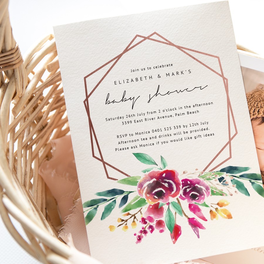 Easily personalise your printed Baby Shower Invitations online in minutes. Featuring a modern minimalist design with sweet florals, these unique Baby Shower Invites are sure to wow your guests!