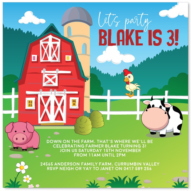 Cute Farm themed Invitations customised to perfection by our designers before printing on your choice of quality cardstock.
