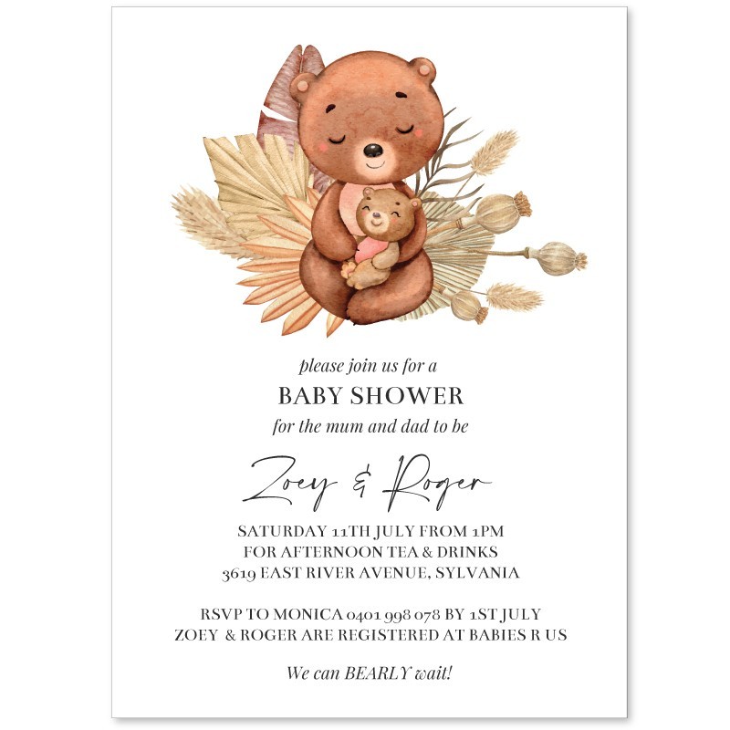 Easily personalise these printed Boho Baby Shower Invitations online in minutes. Featuring the sweetest little mum and baby bear hug, your printed Baby Shower Invites are sure to wow your guests! Matching thank you cards, gift tags and books for baby cards are available to coordinate your Baby Shower in style.