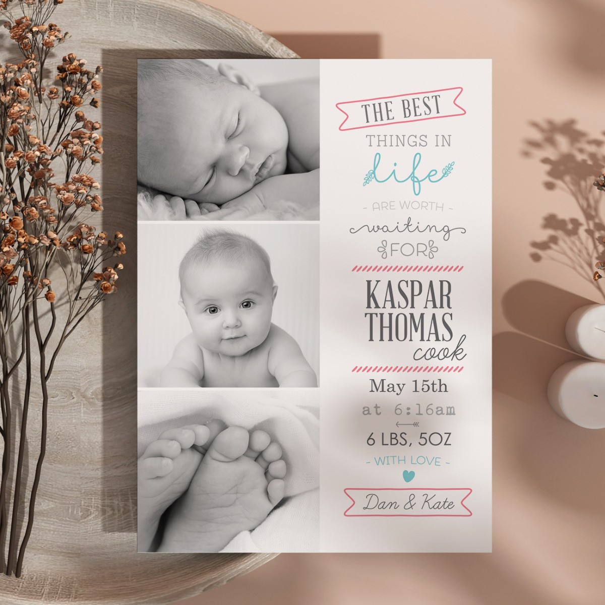Available to customise in 3 unique pastel colourways, these beautiful photo cards are the perfect way to thank friends and family and introduce your new bundle of joy.