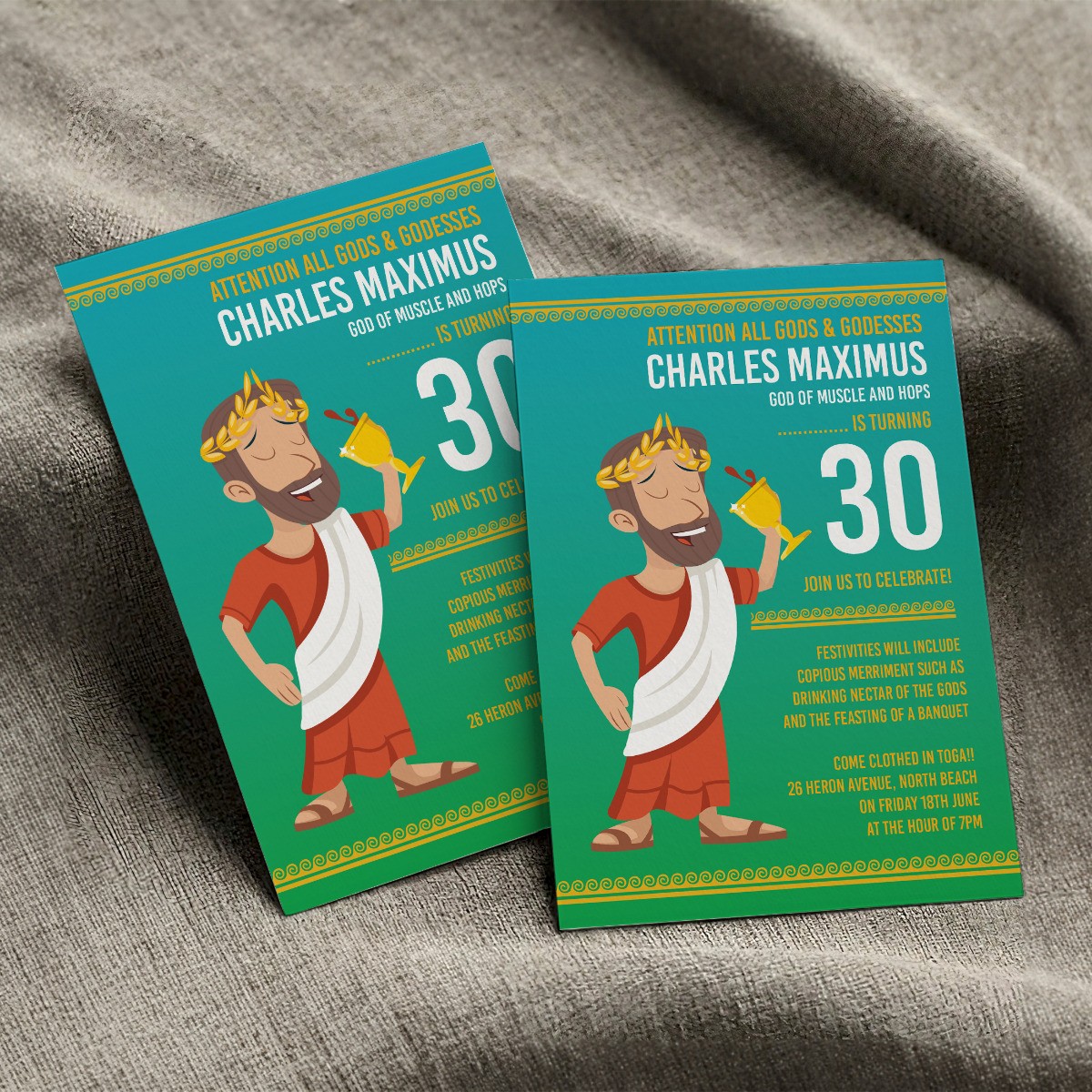This invitation features an illustrated Roman male wearing a toga, perfect for fun themed parties. Printed on high-quality cardstock in Australia, it is ideal for mailing or hand delivery. The invitations bright colors and sharp details are sure to capture your guests’ attention and the classic Roman design adds a unique and playful touch to your event invitations.