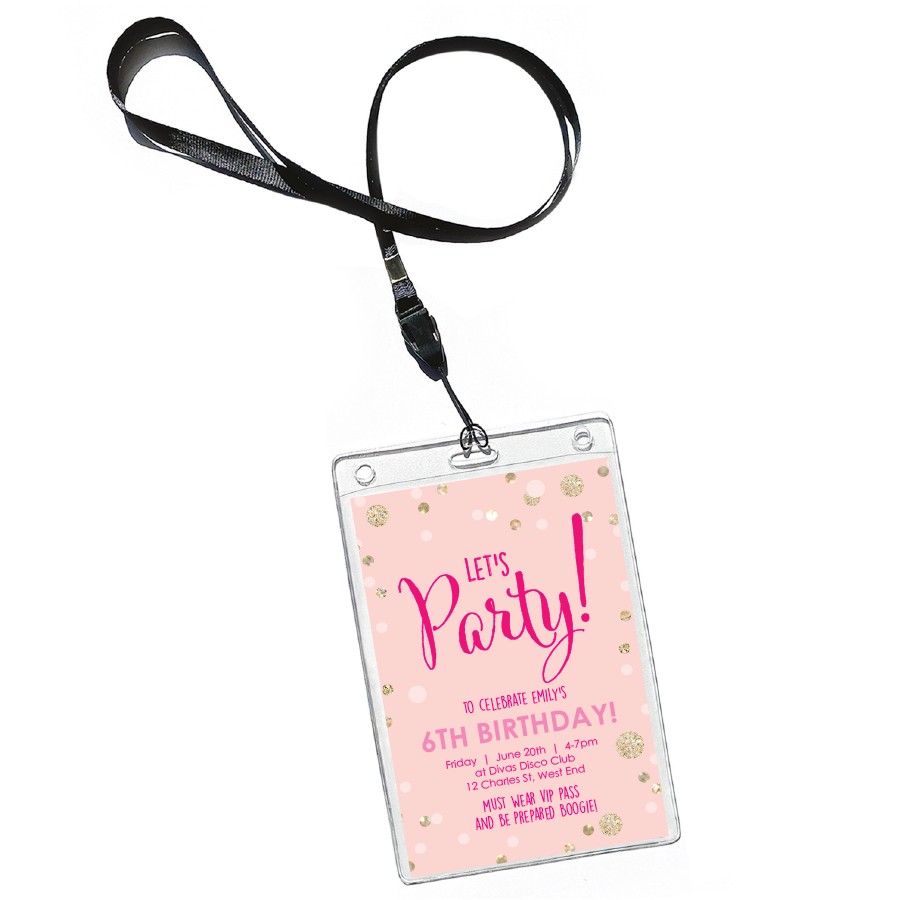The invitation simply slips into the supplied plastic sleeve and attaches to a black fabric lanyard to be used as admission to the big event!