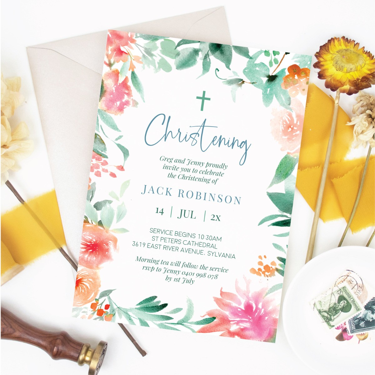 Beautiful floral religious Invitations easily customized online in minutes. Beautifully designed by our in-house team of designers, these Invitations can be used for a Christening, Baptism, Holy Communion or Confirmation and are sure to impress your guests.   Your text alignment will be perfect by a graphic designer before your cards are printed using the best in print technology.