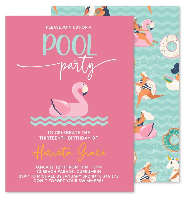 Your beautiful Pool Party Invitations customized to perfection by our team of designers - Satisfaction guaranteed and quick delivery!
