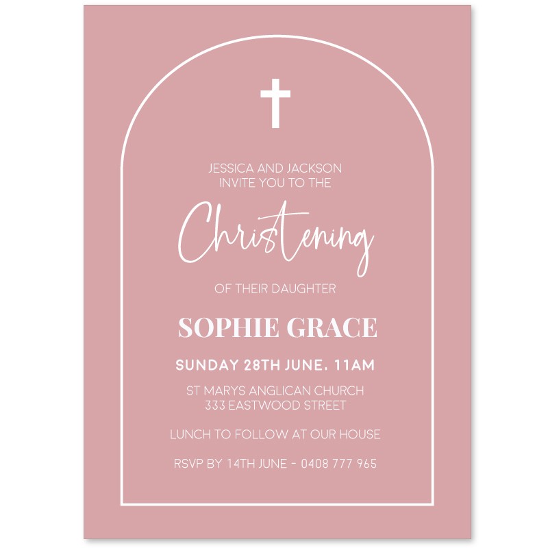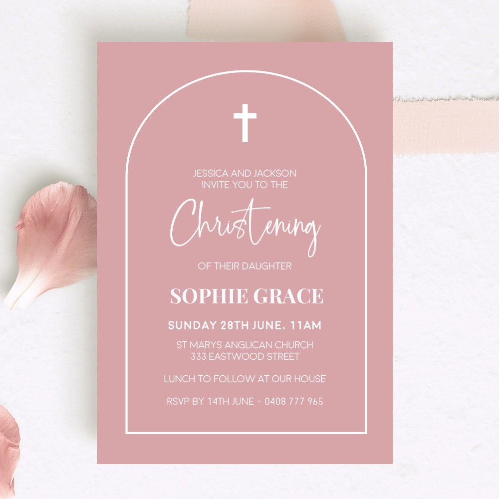 Easily personalise these Beautiful Christening cards online in minutes. Designed by our in-house team of designers, these Dusty Rose Pink Christening Invitations are sure to impress your guests! Featuring a modern arch design and on-trend colour palette.