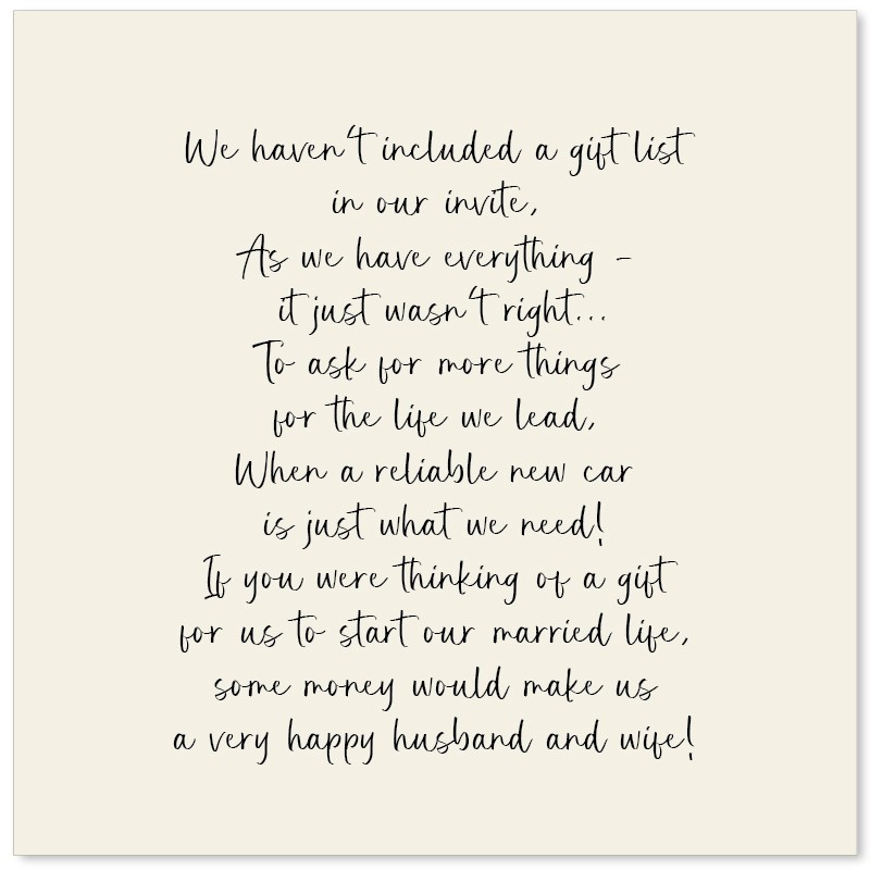 Wishing Well Inserts are the ideal way to politely let guests know what to gift you. These Modern minimalist Gift Cards can include your choice of wording such as Registry Information or perhaps a cute Wishing Well Poem. They have been designed to perfectly match your Invitations and matching stationery.   Your Wishing Well text will be perfectly aligned by a graphci designer and your cards will be printed onto your choice of premium cardstock and Shipped Quickly.