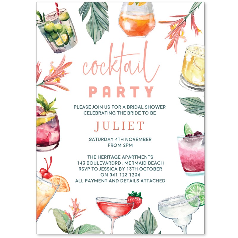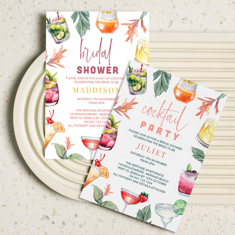 Custom Bridal Shower Invitations are the perfect way to invite family and friends to your cocktail event. These fun and bright Invitations feature hand-drawn watercolour illustrations and can be quickly personalised online to suit your celebration. We are proud to offer thick quality cardstocks and quick shipping for all of our Invitations at affordable prices.
