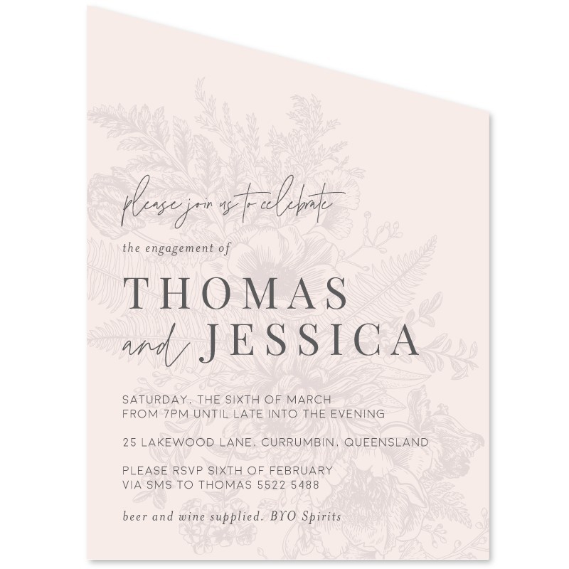 Easily personalise your details online and our designers will perfect your alignment before printing and finishing your Engagement Invitations. Our Angle shape cards are 18cm on the long edge and fit perfectly into our Quality A7 Envelopes. We are proud to offer memorable Engagement Party Invitations shipped quickly Australia-wide.