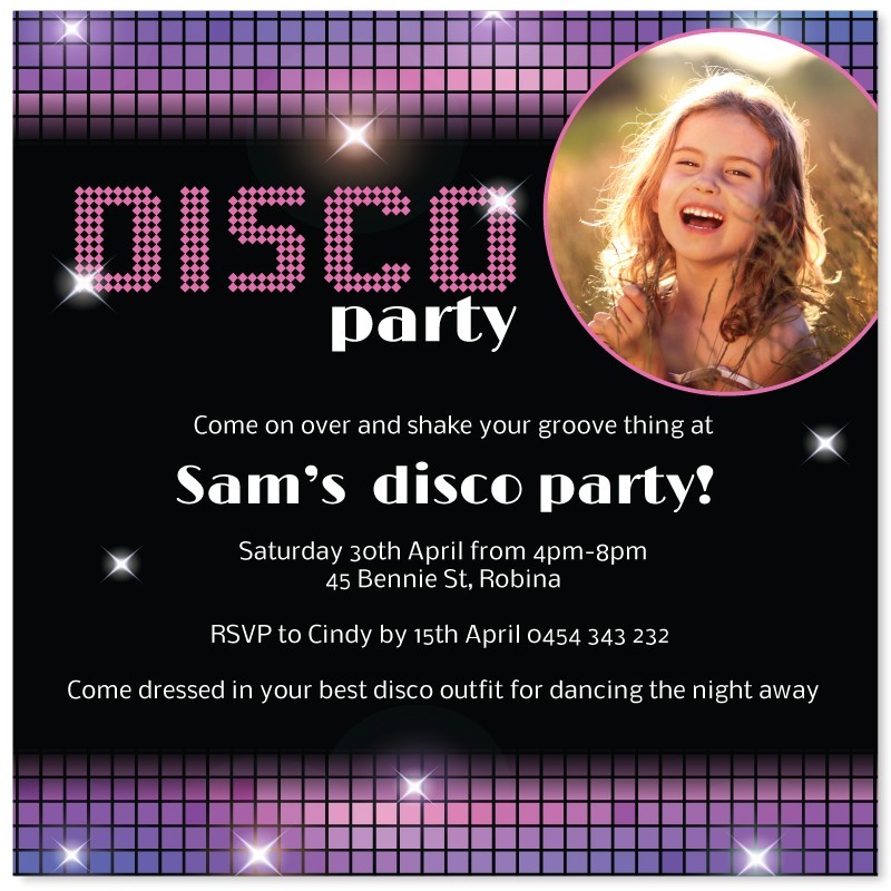 Printed onto our unique larger square card size, these disco party invitations are sure to set the tone for your party. Invitations can be personalised online easily in minutes. Our graphic designers will then perfect your alignment and print onto your choice of quality cardstock. The rich black background in this design looks great on our premium silk cardstock.