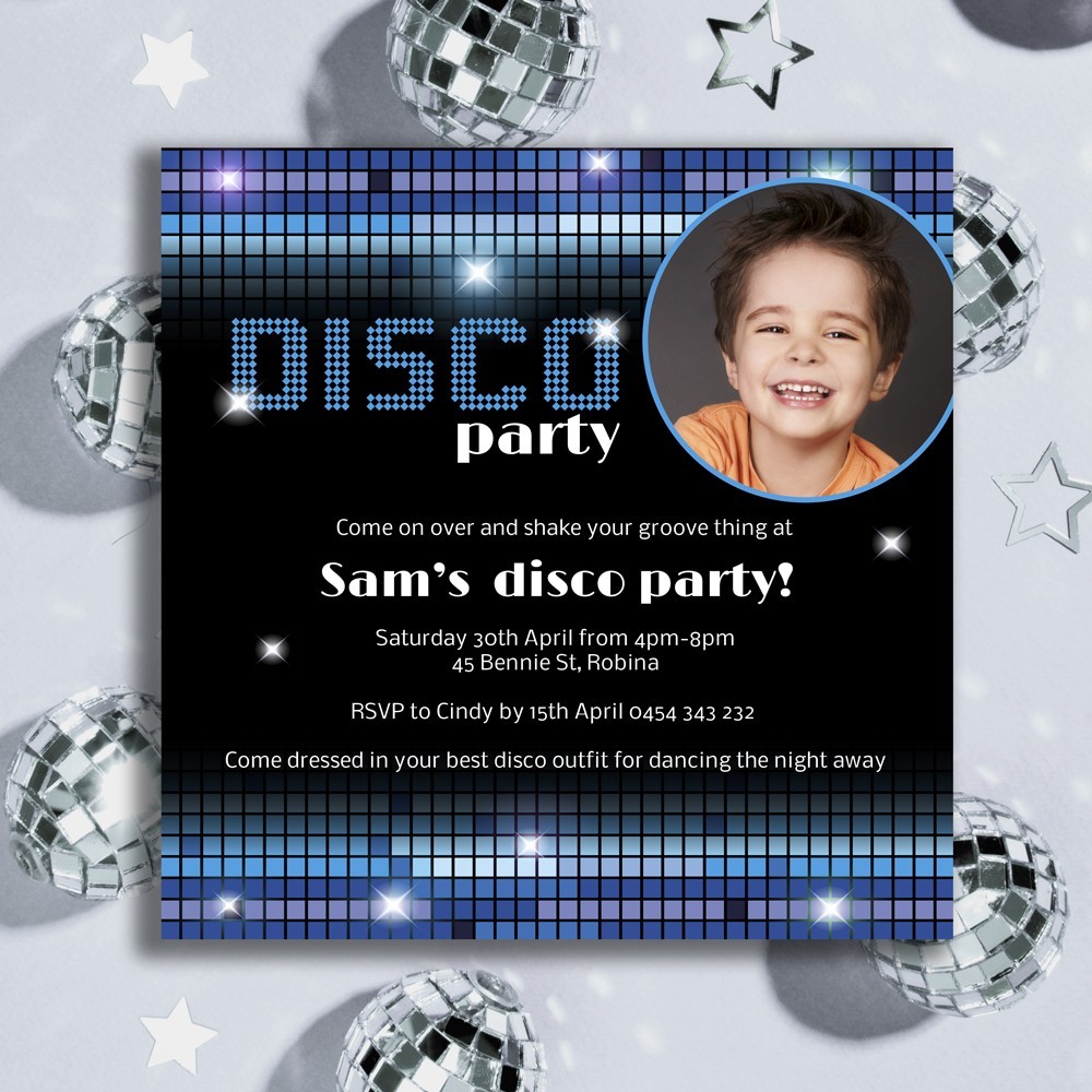 Printed onto our unique larger square card size, these disco party invitations are sure to set the tone for your party. Invitations can be personalised online easily in minutes. Our graphic designers will then perfect your alignment and print onto your choice of quality cardstock. The rich black background in this design looks great on our premium silk cardstock.