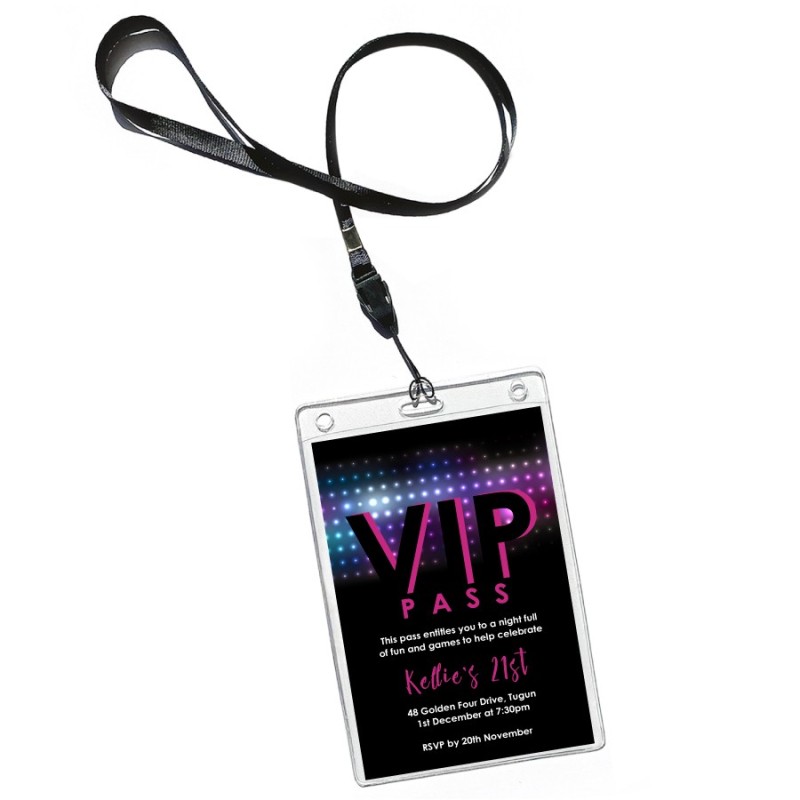 The invitation simply slips into the supplied plastic sleeve and attaches to a black fabric lanyard to be used as admission to the big event! Simple customer assembly is required.