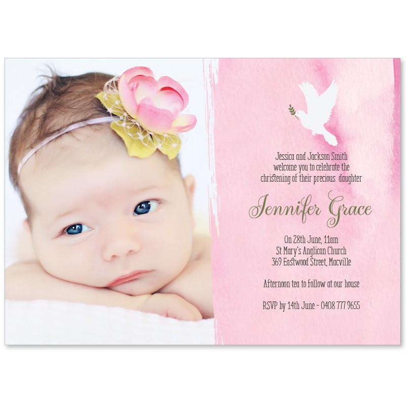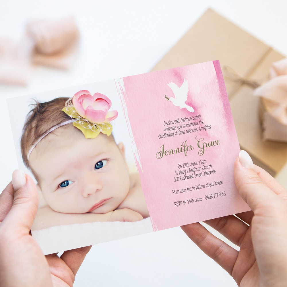 Beautifully designed by our in-house team of designers, these Christening Invitations are sure to impress your guests! Featuring watercolour pink and a modern minimalistic design they are suitable for any religious celebration.
