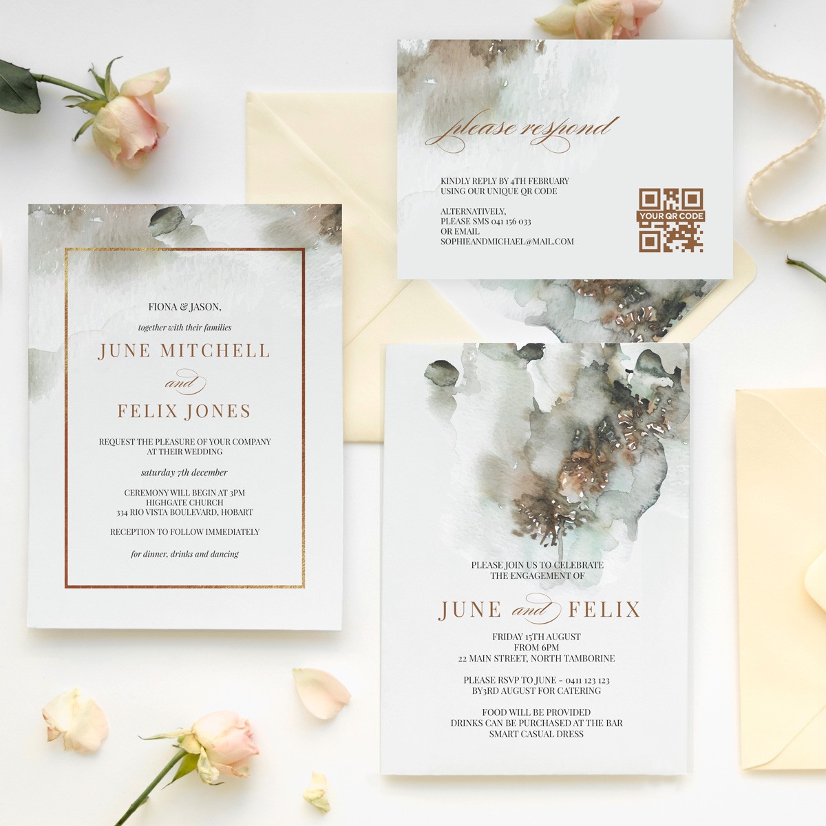 Created by the Paper Divas team of designers, your Engagement Invitations will be printed on your choice of luxe paper and sure to set the tone for your Engagement celebration. A soft watercolour wash with modern typography lends a sophisticated and luxe vibe for your celebration.