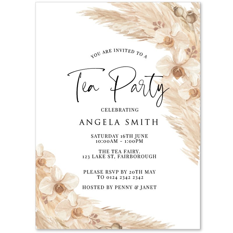 Beautiful High Tea Party Invitations printed onto thick quality cardstocks. Easily personalise your details online and our designers will perfect your alignment before printing and finishing.