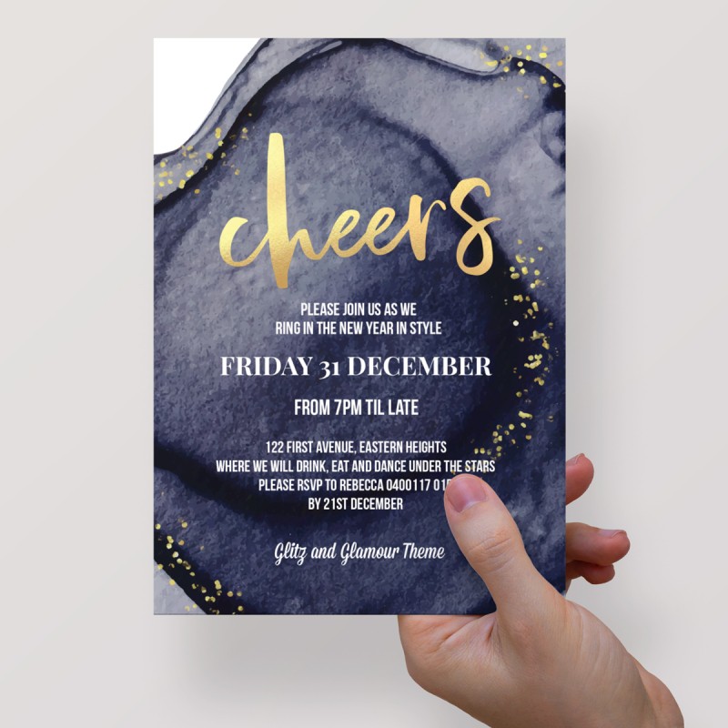 Navy Blue and Gold Luxe New Years Eve Party Invitations.