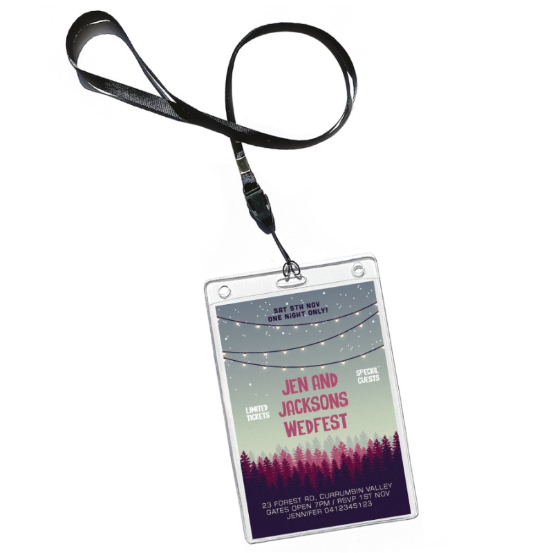 The invitation simply slips into the supplied plastic sleeve and attaches to a black fabric lanyard to be used as admission to the big event! Simple customer assembly is required.