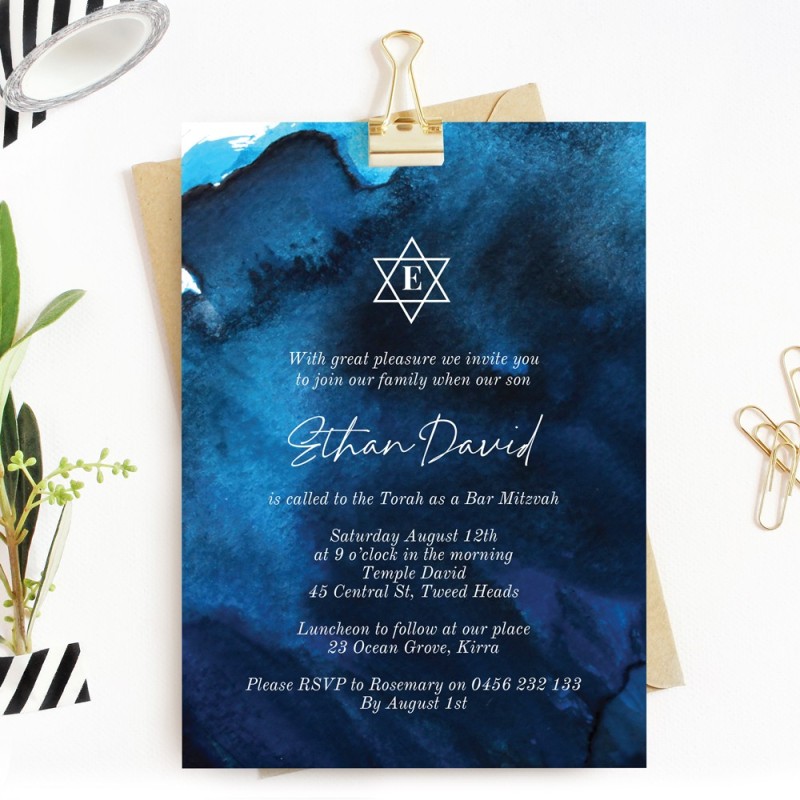 Customised Bar Mitzvah and Bat Mitzvah Invitations are the perfect way to invite family and friends to your joyful event. These Modern Bar Mitzvah Invitations feature a deep navy watercolour background and modern design, and can be easily personalised online quickly.