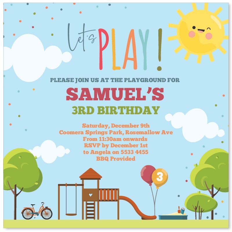 The perfect way to invite guests to your little one's birthday! Fun playground themed Invitations perfect for a boy or girl. Customise easily online in minutes and a graphic designer will perfect your text alignment before printing on quality cardstock. Fastest processing and shipping.