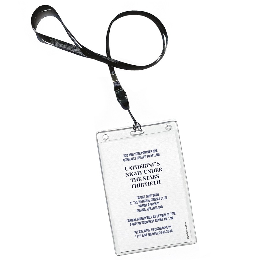 The invitation simply slips into the supplied plastic sleeve and attaches to a black fabric lanyard. Enter all your party details online or simply personalise the front to be used as admission to the big event! Simple customer assembly is required.