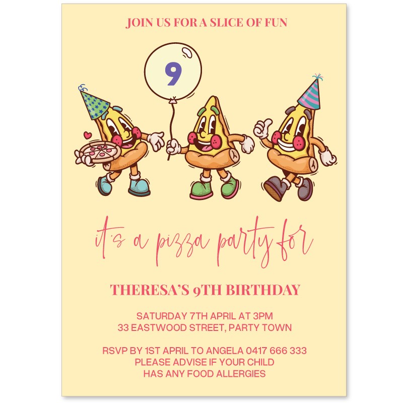 Personalise the cutest Pizza Party Invitations online in minutes. No software needed - use our unique card editor quickly and easily. A graphic designer will perfect your text alignment before printing on your choice of thick cardstock.