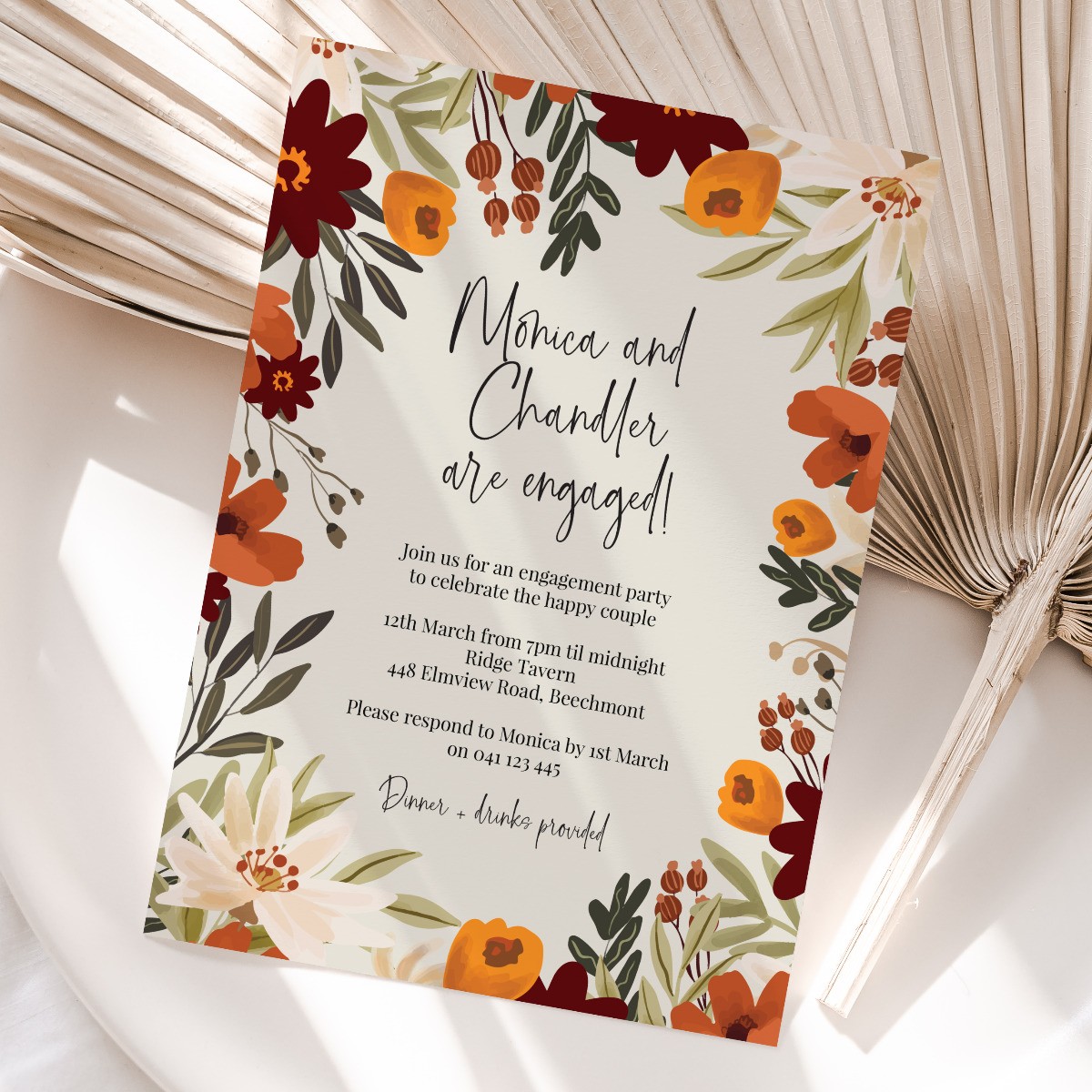 Featuring deep earthy tones, these beautiful Invitations are sure to impress. Easily personalise your details online and our designers will perfect your alignment before printing and finishing your Engagement Invitations. Proudly offering the highest quality thick cardstocks and the latest in digital printing, at the most affordable prices. Full range of matching products available.