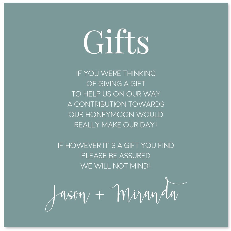 Wishing Well Cards are the easiest way to politely let guests know what to gift you. Your Cards can include your choice of wording such as Registry Information or perhaps a cute Wishing Well Poem. They have been designed to perfectly match our Seabreeze Wedding Invitations and other enclosure cards.