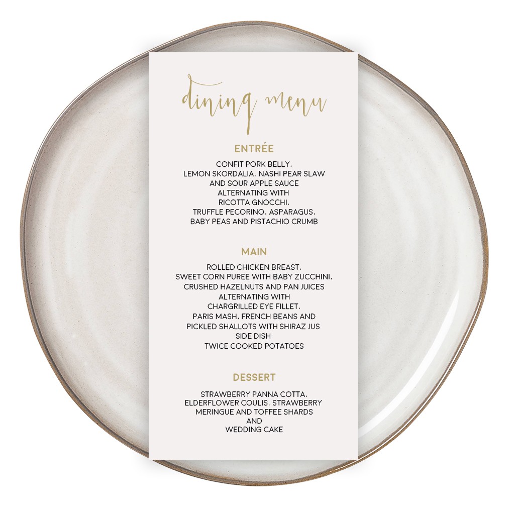 Beautiful Modern Wedding Menus by Paper Divas. Simply personalise online in minutes and our team of graphic designers will perfect alignment before printing onto your choice of quality cardstock.