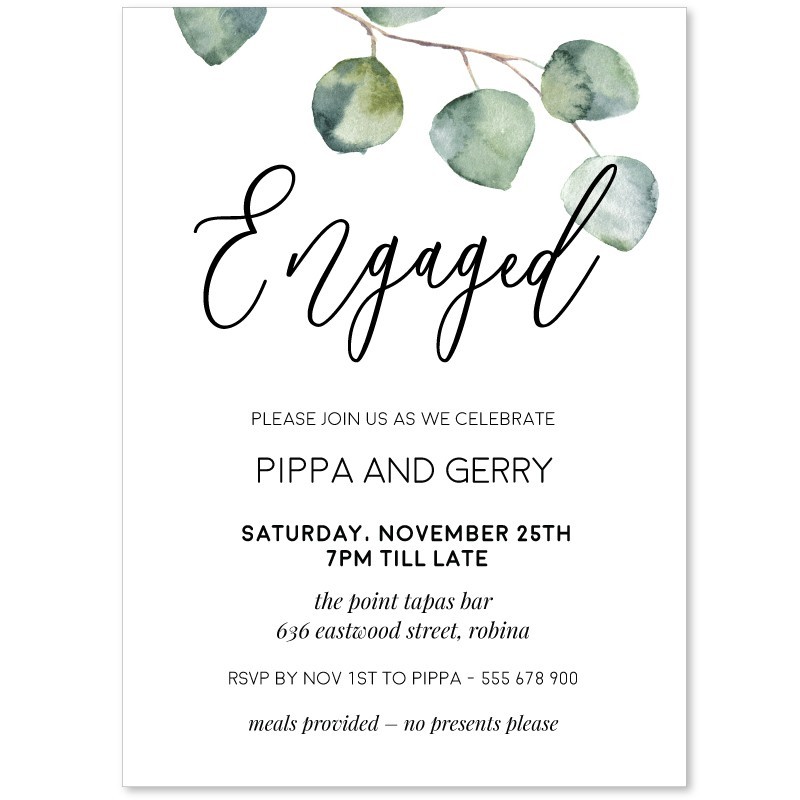 Featuring handpainted eucalyptus leaves, your unique Engagement Invitations will be customized to perfection by our team of designers - Satisfaction guaranteed and quick delivery!