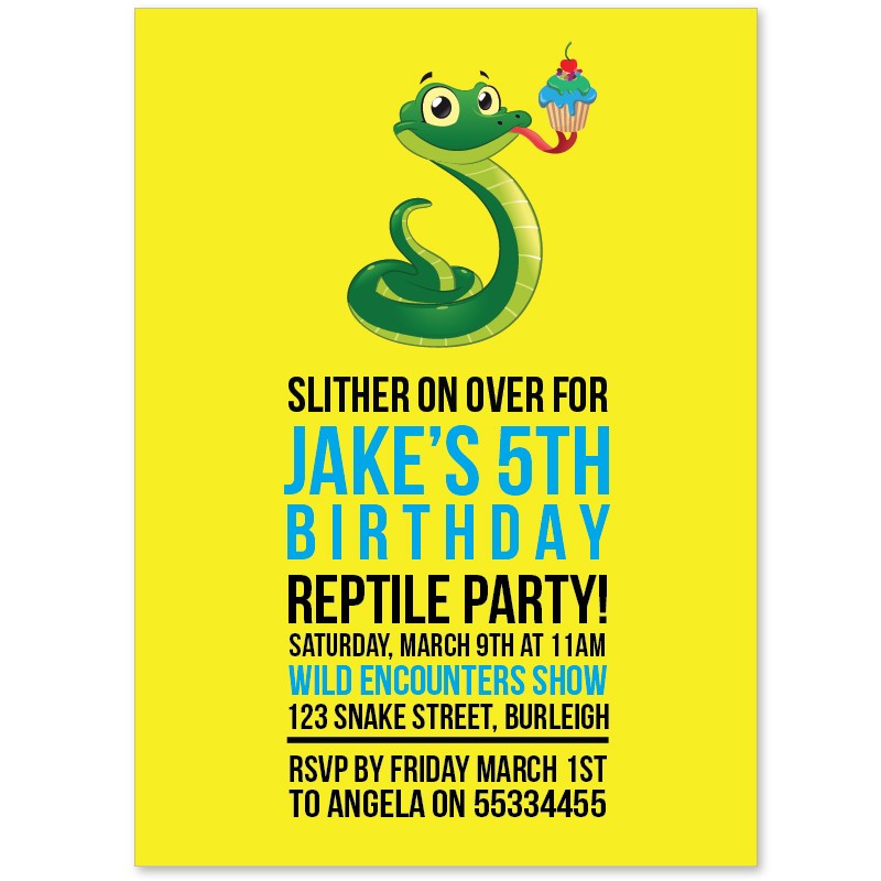Bright and fun reptile party invitations that are sure to excite your guests. Easily customise your details online and our designers will perfect your text alignment before printing and finishing. Choose matching colourful envelopes during the ordering process to really set your Invites apart.
