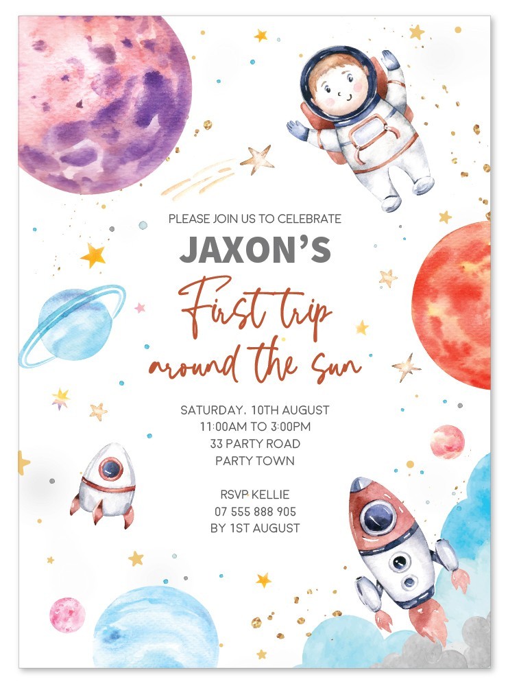 Quickly personalise these super cute first trip around the sun invitations online and our designers will perfect your alignment before printing and finishing.