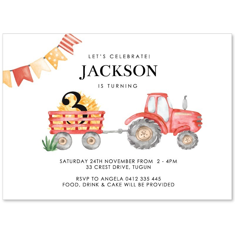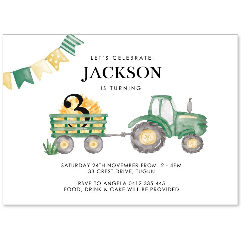 These Watercolour Tractor Birthday Invitations will be customized to perfection by our team of designers (including the number in the tractor). Satisfaction guaranteed and quick delivery! Your Cards will be printed onto your choice of high quality thick cardstock using the best in print technology at affordable prices. Proudly 100% Australian.