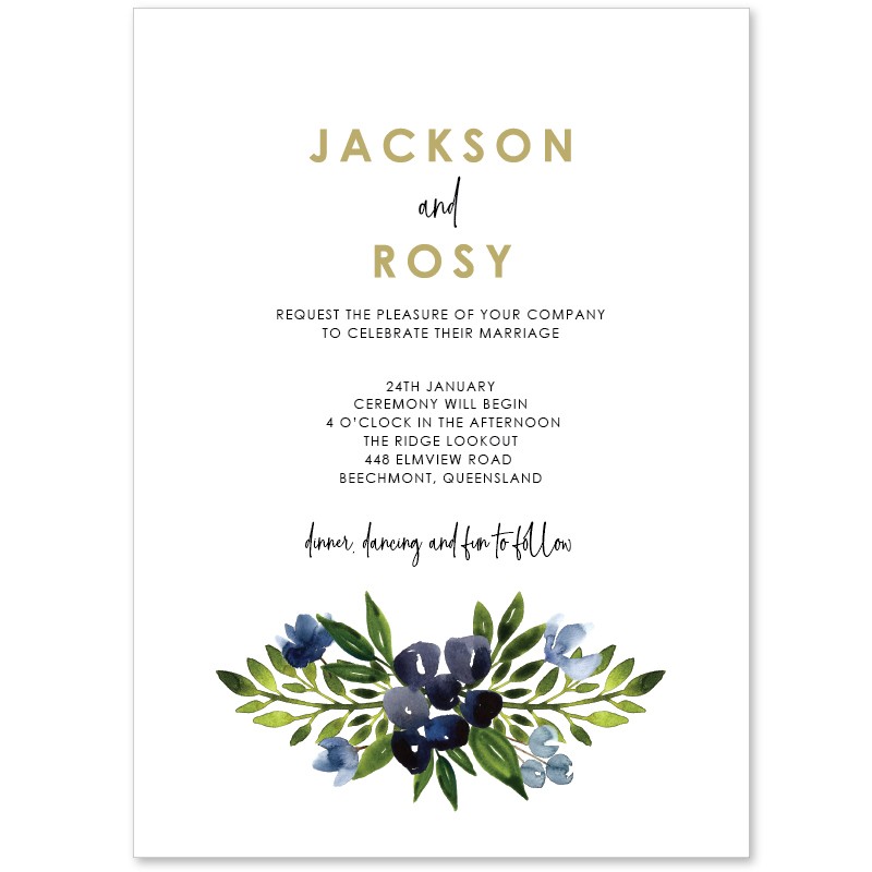 Invite your guests in Style with Paper Divas printed Wedding Invitations and matching stationery. This Beautiful Wedding Invitation features a hand illustrated blue bouquet of flowers and a paired back minimalist style. Each invitation is fully customizable and will be printed on thick cardstock of your choice. Full range of matching accessory cards available to compliment your Invitations.