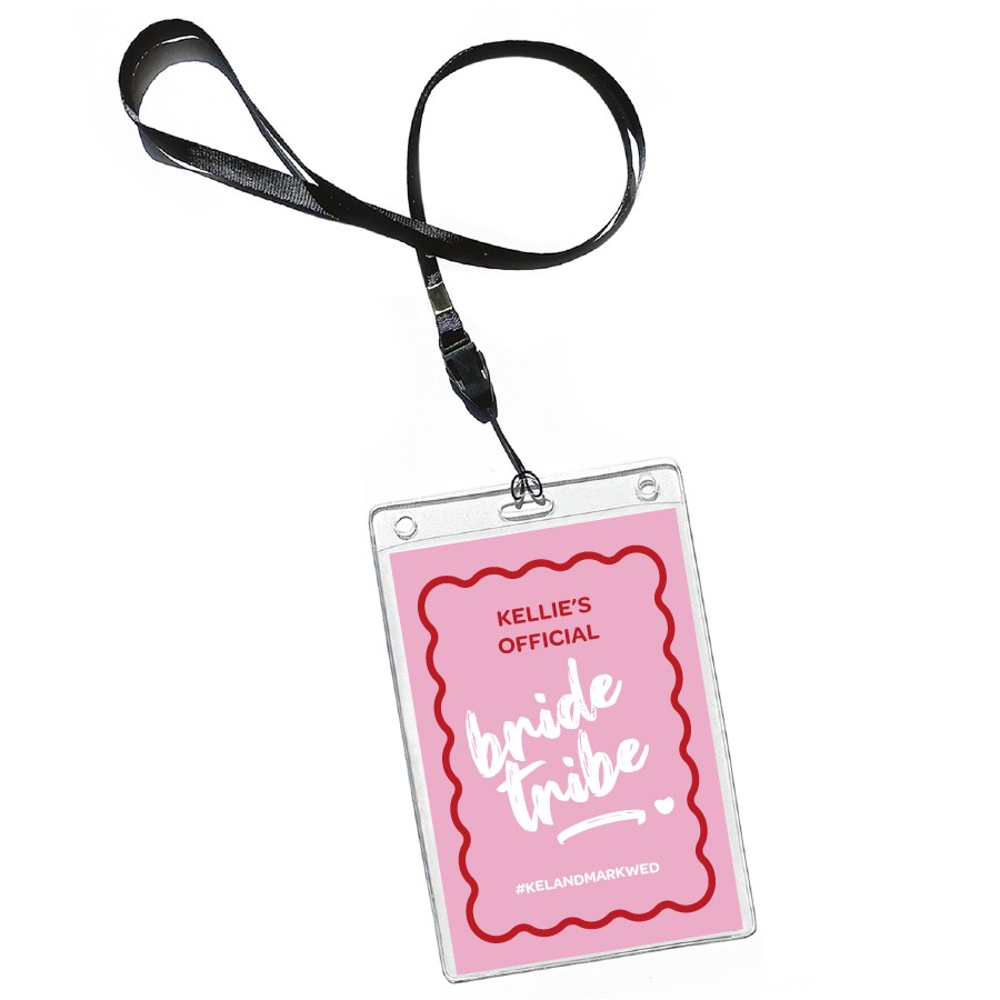 The invitation simply slips into the supplied plastic sleeve and attaches to a black fabric lanyard to be used as admission to the big event!