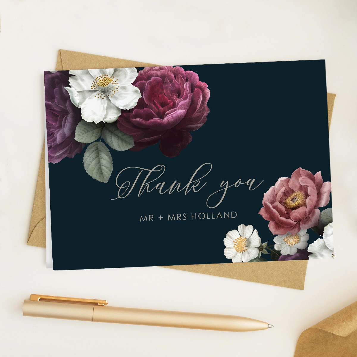 Folded Thank You Cards carefully designed to coordinate with your Invitations + Stationery. Featuring a blank inside allowing you to enter a printed custom message or individually hand-write messages to your friends and family.