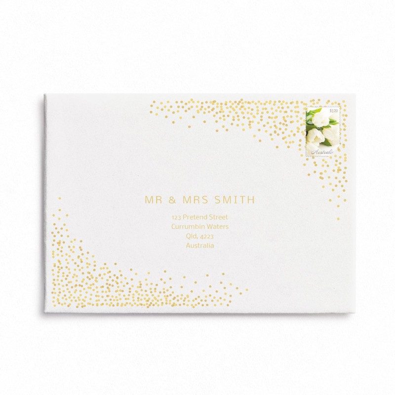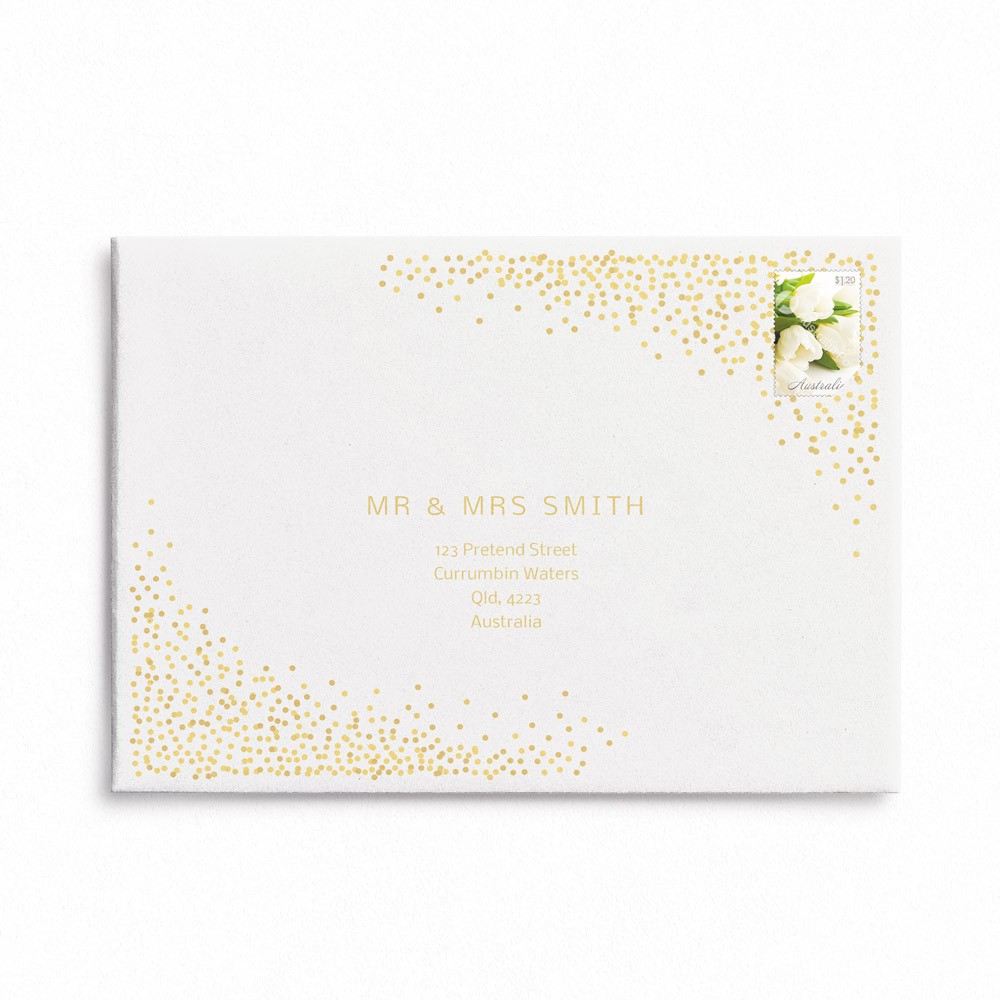Impress your guests with professionally printed envelopes! Simply add this service to your order, and we will print your envelopes with your guests names and addresses. Beautifully designed as shown to match your Wedding Invitations.