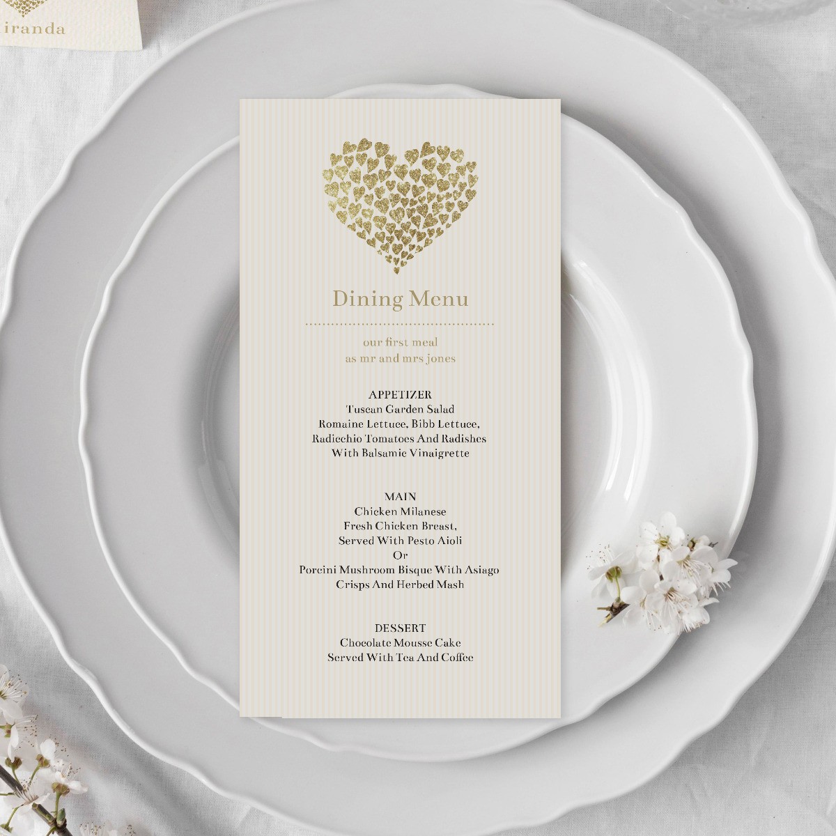 Beautiful custom Menus by Paper Divas. Simply personalise your details online and our team of graphic designers will perfect your text alignment before printing onto your choice of quality cardstock.