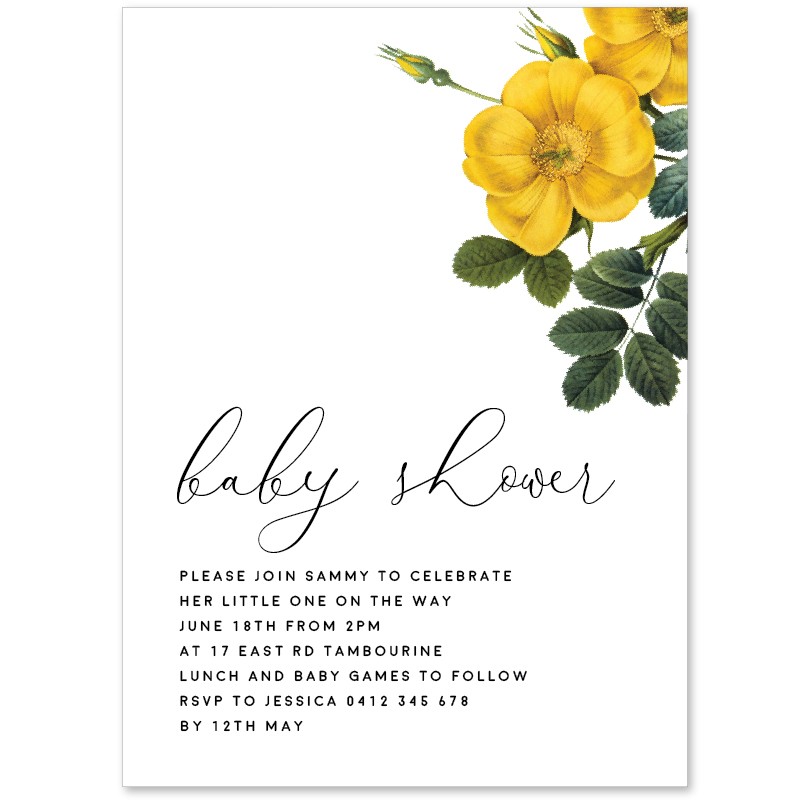 Featuring a beautiful yellow floral design, these Baby Shower Invitations are sure to impress. Printed to perfection by the Paper Divas team.